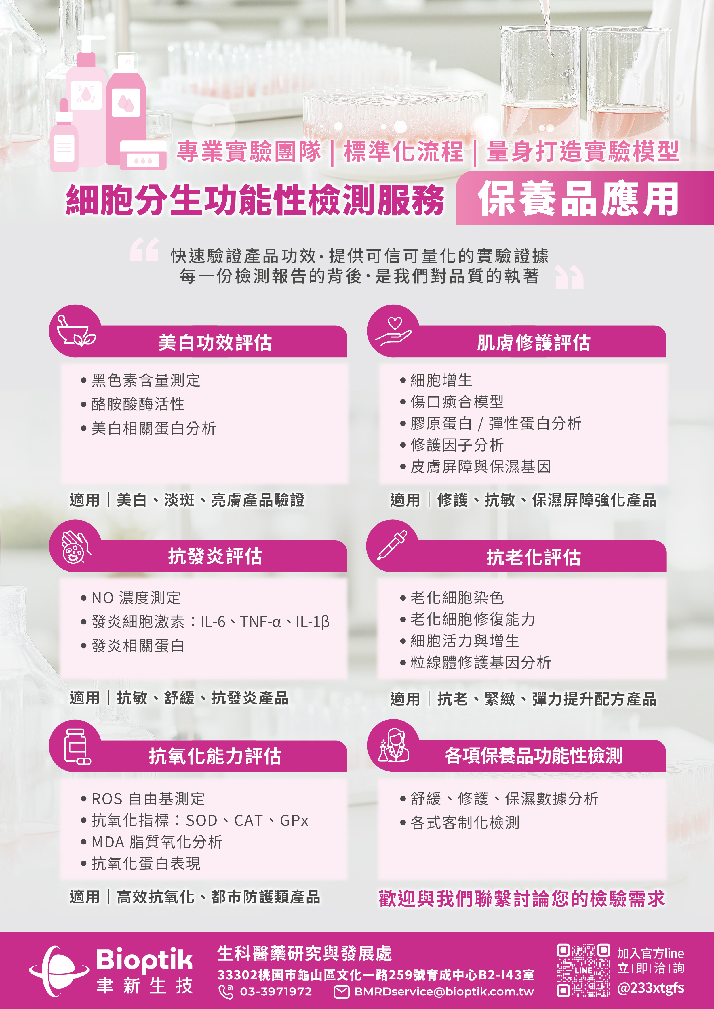 評估分析方法:細胞增生、傷口癒合模型、膠原蛋白/彈性蛋白分析、修護因子分析、皮膚屏障與保濕基因